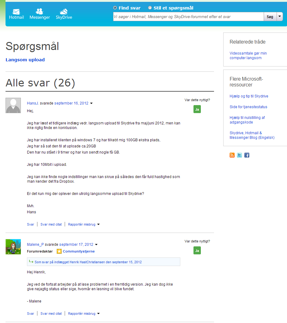 "SkyDrive upload er alt for langsom. (Min) hastighed er hurtig nok 50/5, og Dropbox er meget hurtigere. Forsøger at uploade 50 gigabyte, og efter to aftener mangler der stadig 35 gigabyte" skriver brugeren Lomax_hjs på Microsofts Answers, og han er ikke den eneste.