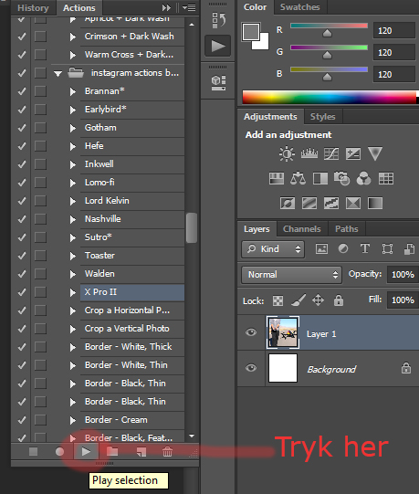 Nu åbner Photoshop sin Action-menu, og du skal blot markere en action og klikke på afspil-ikonet i bunden af menuen.