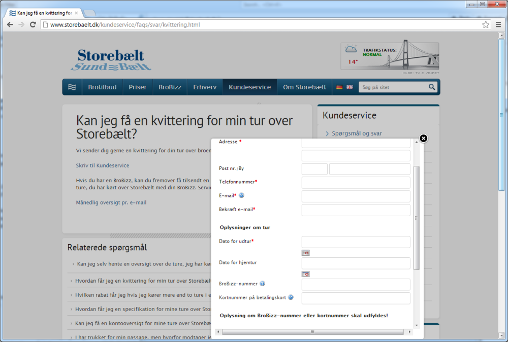 Storebælt har nu stoppet muligheden for at bestille kvitteringer med Dankort-nummeret. Nu kan man kun bestille kvitteringer med sit BroBizz-nummer.