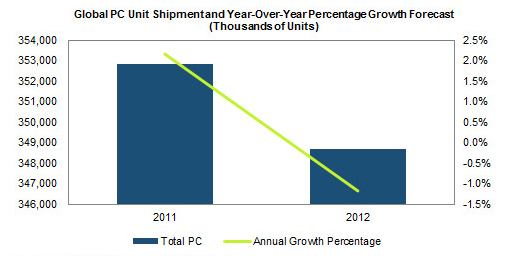 "Det totale pc-marked forventes i 2012 at trække sig sammen med 1,2 procent til 348,7 millioner enheder fra 352,8 i 2011. Ikke siden 2001, for mere end et årti siden, har den globale pc-industri lidt under sådan et fald."