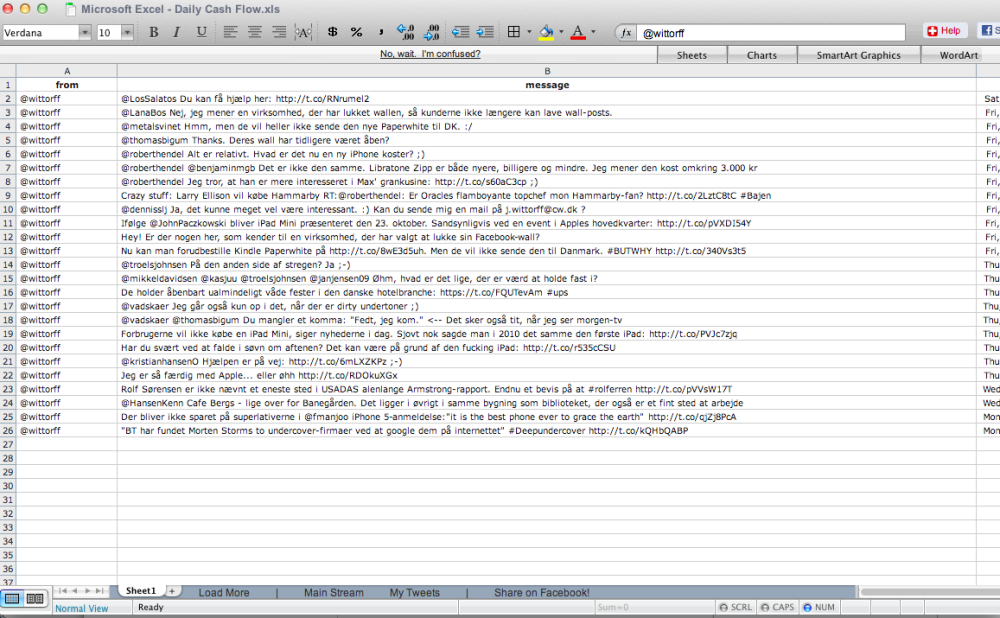 Ikke mindst hvis du har et job, hvor der ofte passerer kunder forbi din computer. Men det kan du løse ved at bruge tjenesten Hardlywork.in. Tjenesten henter alle aktiviteter fra Facebook og Twitter og viser dem i et interface, der på afstand er næsten umulig at skelne fra et regneark.