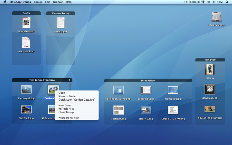 Alternativet vil være at samle filerne i mapper på skrivebordet. Men grupper adskiller sig fra mapper ved at være en slags gennemsigtige små zoner på dit skrivebord - det vil sige, at du kan se indholdet i gruppen uden at åbne den.