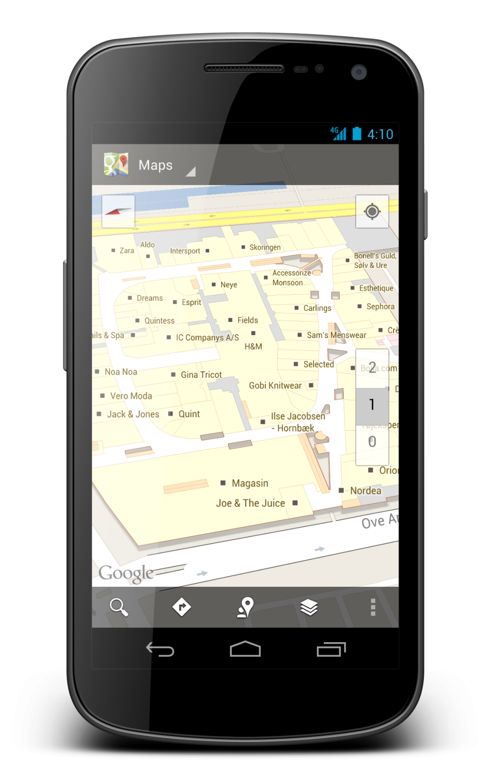 I den seneste udgave af Google Maps på Android vil det detaljerede indendørs-kort automatisk dukke op, når man zoomer ind på en bygning med indendørs-kort. Den blå prik fortæller dig, hvor du er. Både placering og eventuel etage.