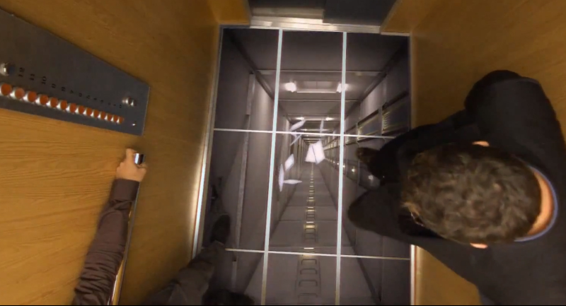 Det lægger ingen personer mærke til, da de træder ind. Da elevatoren sætter i gang, blinker lyset i loftet, og der afspilles en skrækindjagende lyd.
