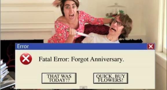 Eksempelvis får manden en runtime error, da han glemmer at tage til træning. Og han får en fatal error, da han glemmer sin og kærestens årsdag.