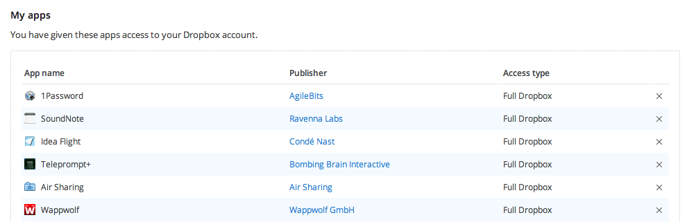Men heldigvis kan du trække adgangen tilbage igen. Det gør du ved at gå ind under settings på din Dropbox konto og herefter vælger fanebladet "My Apps". Du skal blot klikke på krydset ud for de apps, som du ikke længere ønsker skal have adgang til din konto.