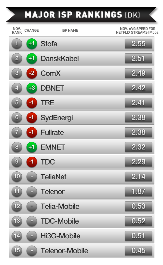 På andenpladsen finder man DanskKabel. Efterfulgt af ComX på tredjepladsen. Teleselskabernes mobile kunder oplever ifølge Netflix de mindst kvikke overførselshastigheder.