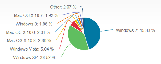 Til sammenligning ligger Windows 7 på mere end 45 procent, Vista på 5,84 procent og XP på mere end 38 procent ifølge Net Applications opgørelse.