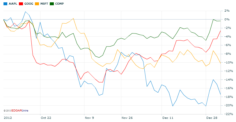 Udviklingen ses i figuren til højre, hvor man også kan se, hvordan Apple-aktien klarer sig sammenlignet med Google, Microsoft og Nasdaq-aktierne (mørkegrøn) i det hele taget (klik for stor størrelse).