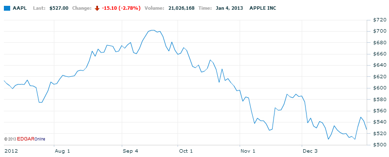 Da Apple-aktien lå på sit højeste den 19. september sidste år, lå den på 702 dollars. I går, den 7. januar, blev den handlet til "blot" 523 dollars på Nasdaq-børsen.