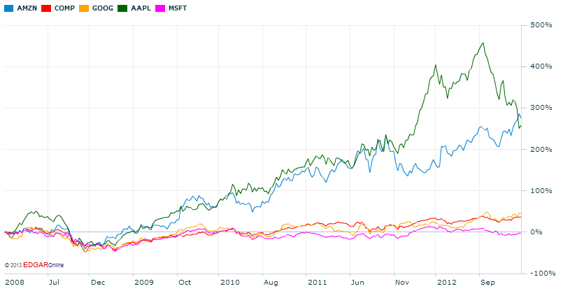Set over eksempelvis en femårig periode, er Amazon et af de eneste selskaber, der har kunnet matche Apples vilde aktie-vækst, og Amazon ligger dermed også et pænt stykke foran selskaber som Google (gul kurve), Microsoft (pink) og Nasdaq-selskaberne generelt (rød).