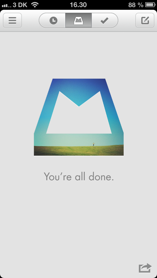 Når du har håndteret samtlige mails, mødes du af en tom indbakke med teksten "You're all done." Teksten ledsages desuden af et udvalgt foto fra Instagram, der skifter hver dag.