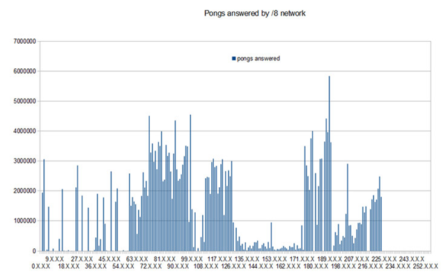 På billedet ses et grafisk overblik over, hvordan svarene for hver enkelt klasse /8 netværk er fordelt. Det vil sige fra 0.X.X.X til 255.X.X.X.