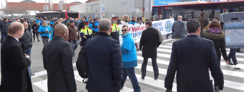 Barcelona: Demonstranter, politi, og lyden af fløjter prægede gadebilledet og forsinkede trafikken her til morgen foran messehallen i Barcelona, hvor verdens største mobilmesse, Mobile World Congress, i denne uge løber af stablen.
