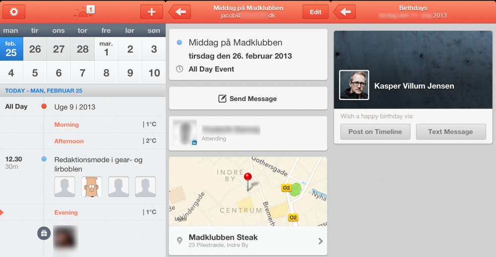 Facebook-integrationen er relativ dyb, og når dine venner har fødselsdag, kan du således vælge at skrive en besked på deres Facebook-timeline eller sende en sms-besked direkte fra Sunrise.