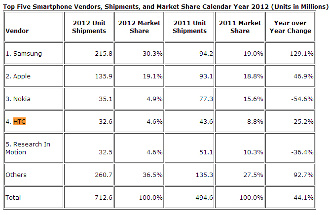 Tal fra IDC [url= https://www.computerworld.dk/art/224235/htc-ramt-af-dramatisk-nedtur-saa-slemt-staar-det-til?page=2]viser[/url], at Samsung i 2012 endte ud med en markedsandel på 30,3 procent af det samlede smartpphone-marked, mens den andenstørste Android-producent, HTC, endte nede på 4,6 procent.