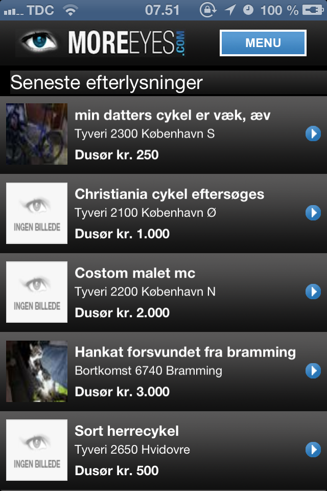 For eksempel MoreEyes.com. MoreEyes er kort sagt et koncept opbygget omkring crowdsourcing. Man opretter en efterlysning af sine forsvundne ejendele. Andre brugere, der har mobilapplikationen installeret (til Android/iOS), kan så give lyd - og få dusør - hvis de finder den forsvundne cykel, bil eller kat i deres nabolag.