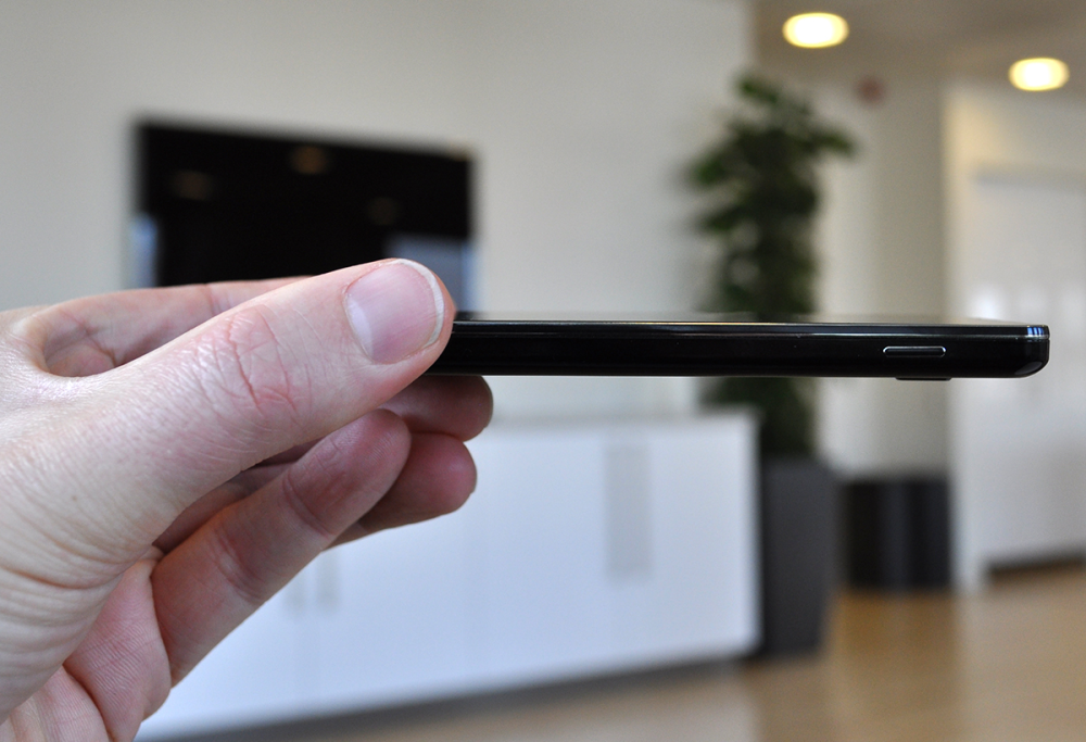 Skærm og ramme flyder derfor næsten sammen, når telefonen holder hvilepause. Bagsiden er ligeledes sort, men der er en smule mønster ligesom på Nexus 4.