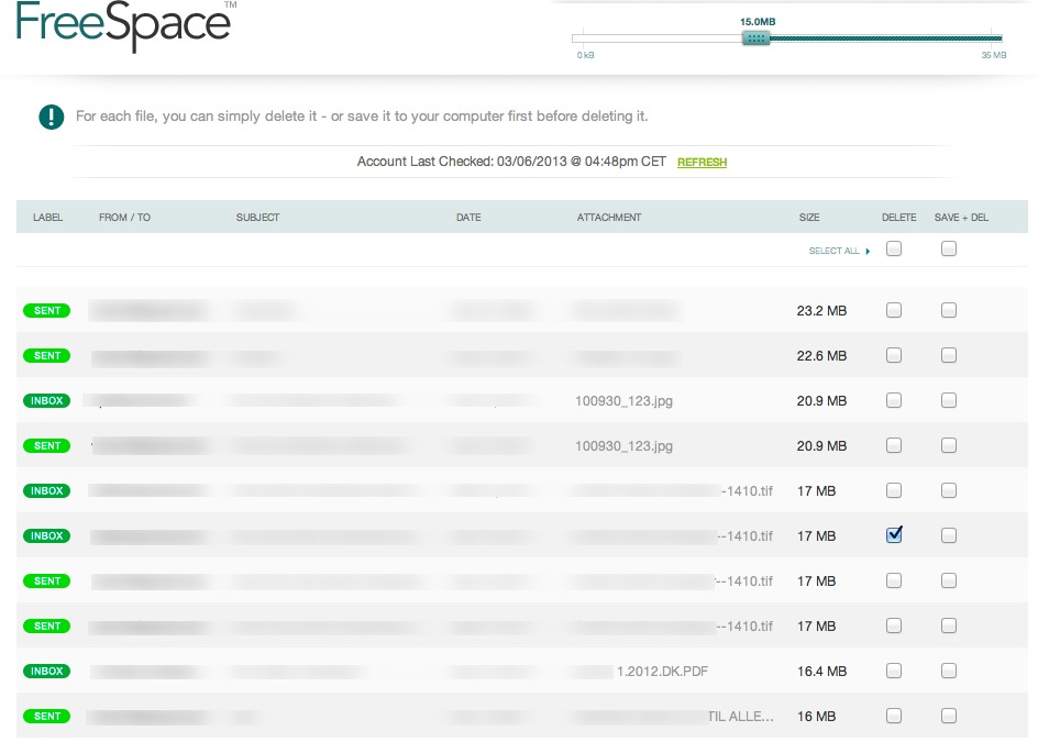 Når du logger ind på Freespace, skanner tjenesten i første omgang hele din mailboks - for denne skribents vedkommende var det mere end 10 GB.