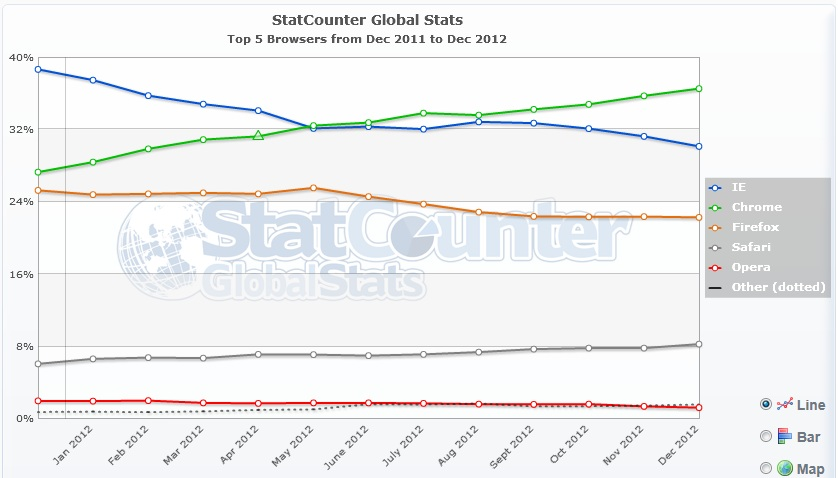 Mens Microsoft i 25 år har været den klare vinder, når det kom til antallet af maskiner, som styresystemet var installeret på, så er det ikke længere helt tilfældet med Internet Explorer.