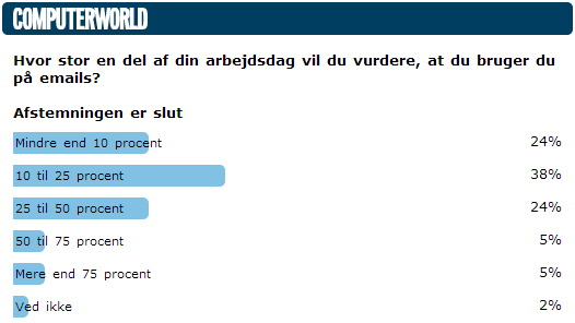 Yderligere 24 procent vurderer, at det er hele 25 til 50 procent af arbejdsdagen, der går med emails, og yderligere 10 procent af stemmerne mener, at det enten er 50 til 75 procent eller endda mere end 75 procent af arbejdsdagen, der bruges på emails.