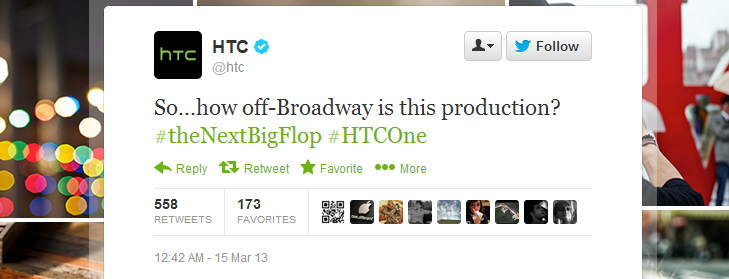 På Twitter kritiserer HTC den Broadway-inspirerede lancering af telefonen efterfulgt af hashtagget TheNextBigFlop.