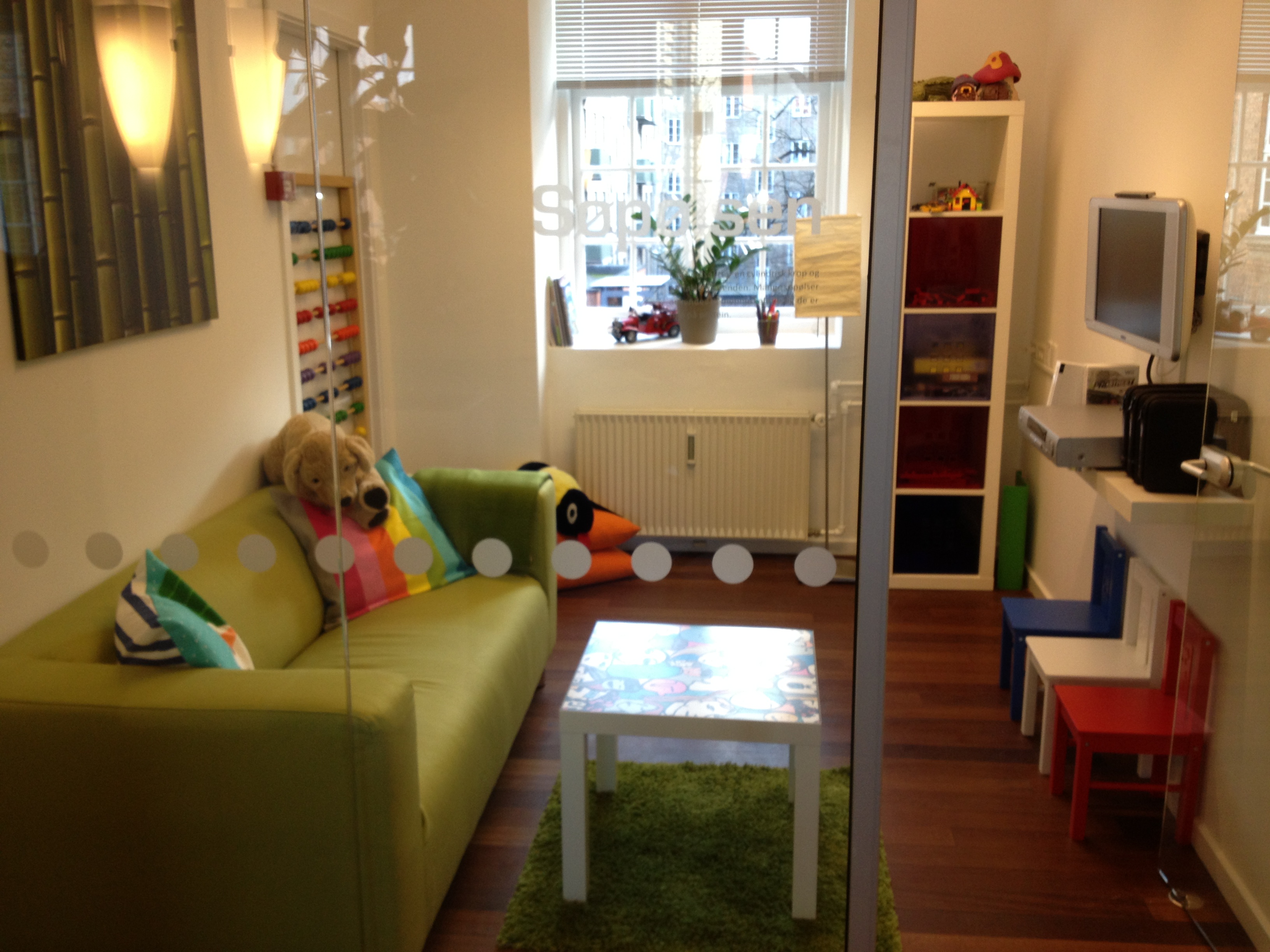 "Kærlighedskonsulenten har faktisk været med helt fra starten, hvor hun fik frit lejde til at skabe en hyggelig arbejdsplads. Så hun gik i krig med bløde sofaer, store puder, malerier og sutsko til alle."