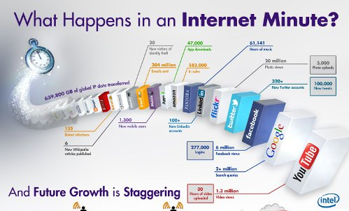 I løbet af et internet-minut bliver der sendt 204 millioner e-mails og downloadet 47.000 apps. Der er 20 millioner billedvisninger hos Flickr og 100.000 nye tweets hos Twitter. Google noterer mere end to millioner søgeforespørgsler og Youtube viser 1,3 millioner videoklip.