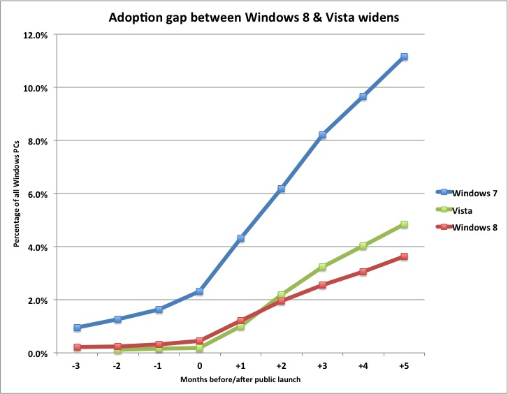 Ifølge analysehuset Net Applications havde Vista efter fem måneder på markedet indtaget lige knap fem procent af verdensmarkedet, hvilket betyder, at Windows 8 udbredes væsentlig langsommere.