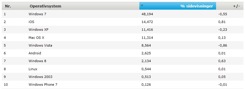 Windows 7 ligger nogenlunde konstant med en udbredelse på 49 procent.