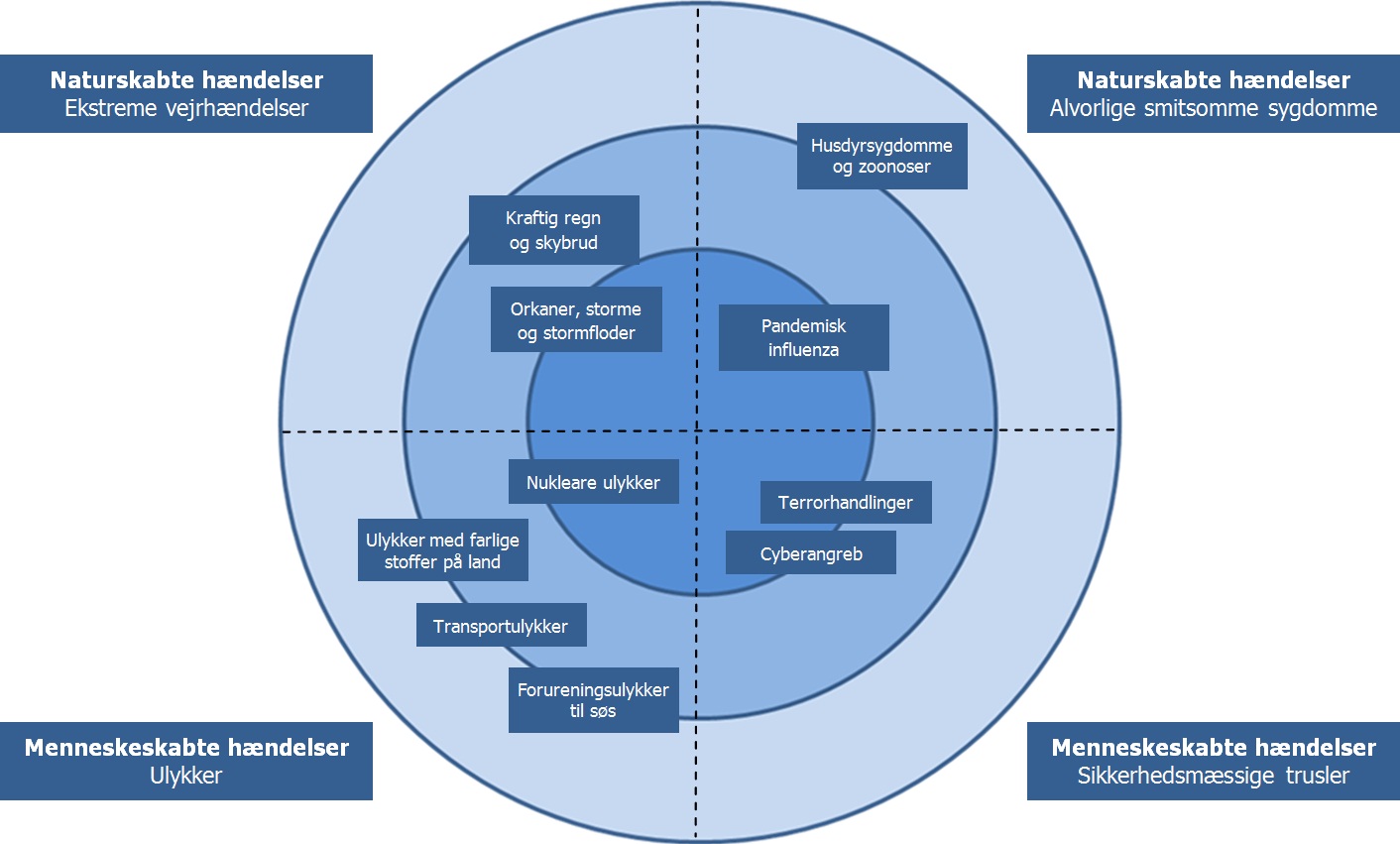 Vurderingen er foretaget på baggrund af hændelsestypernes mulige konsekvenser for liv, helbred, velfærd, ejendom, økonomi, miljø samt tilgængeligheden af kritiske samfundsfunktioner, lyder det fra Beredskabsstyrelsen.