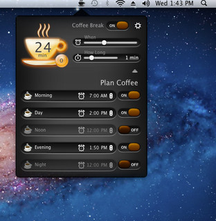 Med Coffee Break kan du planlægge op til fem kaffepauser i løbet af en dag. Du vil modtage en reminder umiddelbart før kaffepausen, og når det er tid til pausen, vil din skærm langsomt blive mørkere. Først når pausen er overstået, vil skærmen igen lyse for fuld styrke.