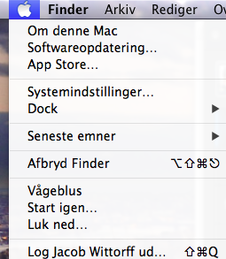 Menuen viser en tastaturgenvej til at afslutte det forreste program. Men bliv nu ikke alt for begejstret: Jeg har uden succes forsøgt at bruge denne genvej på fem forskellige computere med både Lion og Mountain Lion. Det virker kun at vælge fra menuen.
