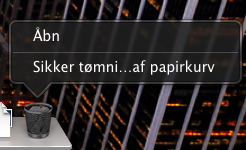 Du behøver ikke at finde Tøm papirkurv helt oppe i menuen Finder, hvis din cursor er nede ved docken. Ctrl-klik på Papirkurv for at få en kort menu frem med kommandoen Tøm papirkurv. Hvis du har følsomme data og gerne vil slette dine filer mere sikkert (når man tømmer papirkurven almindeligt, kan filerne stadig gendannes med specialsoftware), så tryk på Kommando-tasten, før eller efter du har åbnet papirkurvens menu, for at få kommandoen Sikker tømning af papirkurv frem.
