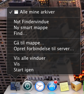 Når du har problemer med Finder - den fryser eller vinduerne bliver underlige, når du ændre visning - så er den bedste kur som regel at genstarte Finder. Du får adgang til kommandoen ‘Start igen' ved at trykke på Alternativ-tasten og herefter klikke på ikonet Finder i docken, hvilket får Finders menu frem. (Til forskel fra andre tilfælde hvor du ændrer dock-menuen ved hjælp af Alternativ-tasten, kræves det i dette tilfælde, at du trykker Alternativ-tasten, før du åbner menuen.)