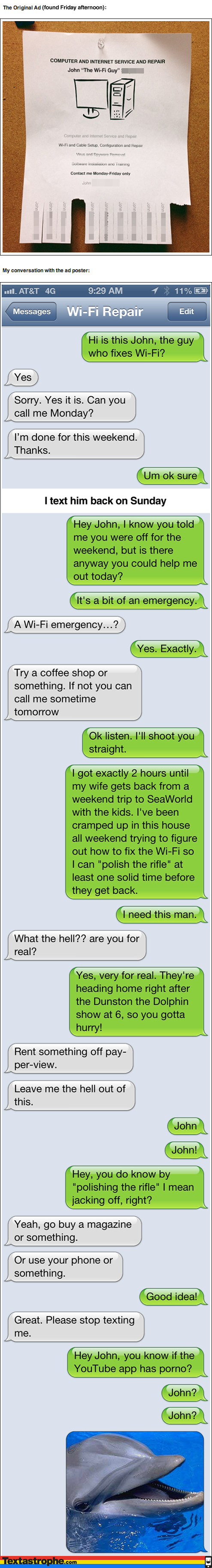 Drillepinden foregiver at være en hjælpeløs familiefar, der ubønhørligt prygler WiFi-reparatøren om hjælp til sit døde WiFi-signal, så familiefaderen kan nå at finde porno på nettet - inden resten af familien kommer hjem. En klagesang som gør reparatøren mere og mere pinligt berørt.