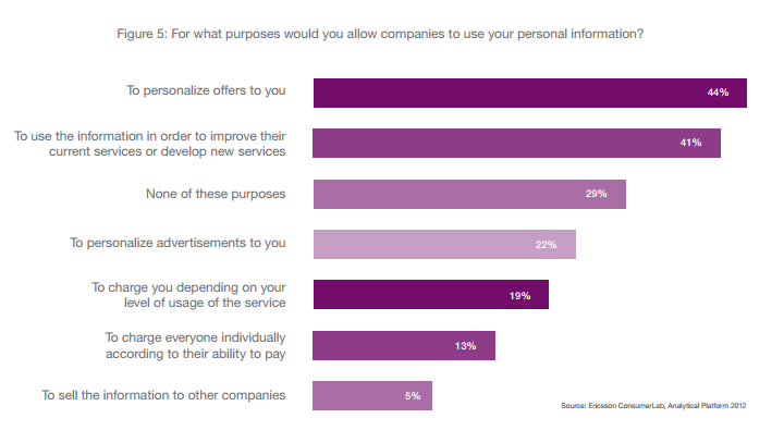 Her svarer kun fem procent, at de gerne vil dele personlige data med firmaer, hvis firmaerne videresælger oplysningerne. Til gengæld vil cirka 44 procent gerne lade firmaer indsamle og gemme personlige oplysninger, hvis det kan forbedre deres fremtidige købsoplevelser - eller give dem følelsen af en "individuel behandling".
