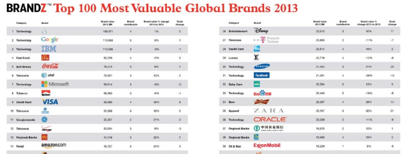 Brandz Top 100 placerer således søgegiganten Google på andenpladsen, med en værdi på 650 milliarder kroner, og den blå it-gigant IBM på tredjepladsen med næsten samme varemærkeværdi.