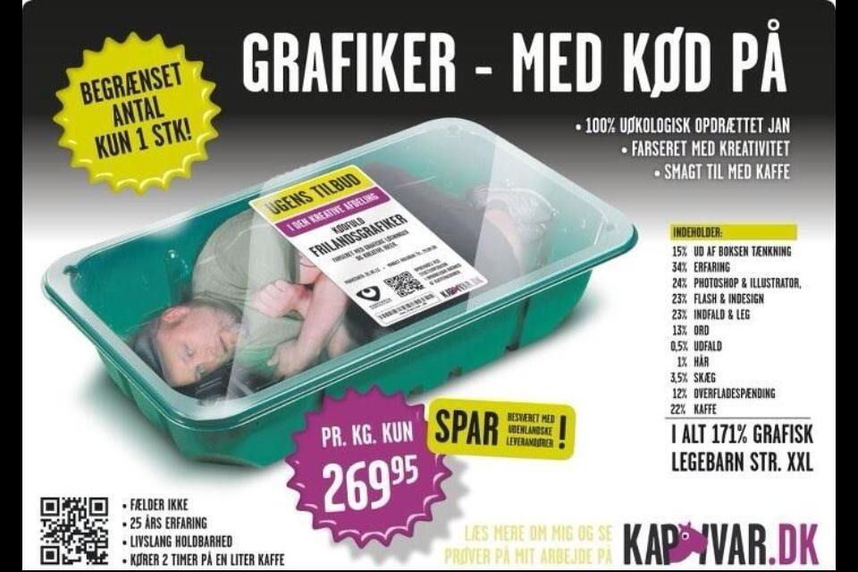 Denne danske grafiker tog også sine grafiske evner i brug, da han konstruerede sin åbne ansøgning i form af en reklame. Med ham selv som et stykke kød.