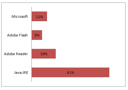 Java JRE er klart mest dominerende i statistikken og tegner sig for 61 procent af de registrerede sikkerhedsproblemer, hvor et system er blevet inficeret.