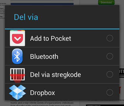 For eksempel bruger jeg Pocket til at gemme gode artikler. På iOS skal jeg enten bruge tid på at oprette en bookmarklet - eller emaile artikler direkte til mig selv for at arkivere dem. På Android er "Send til Pocket" en integreret del i telefonen, så snart Pocket-app'en er installeret (se billedet).