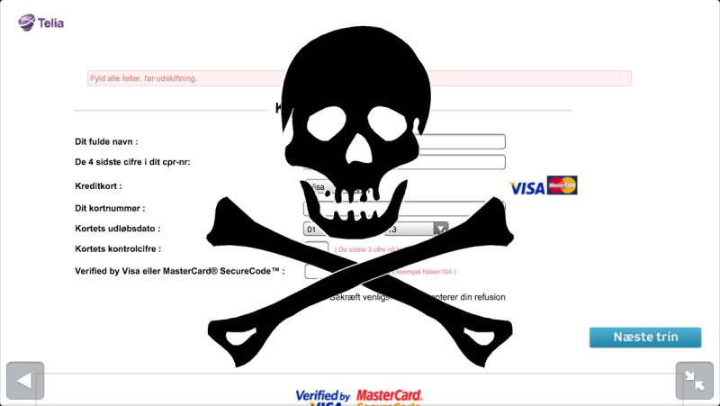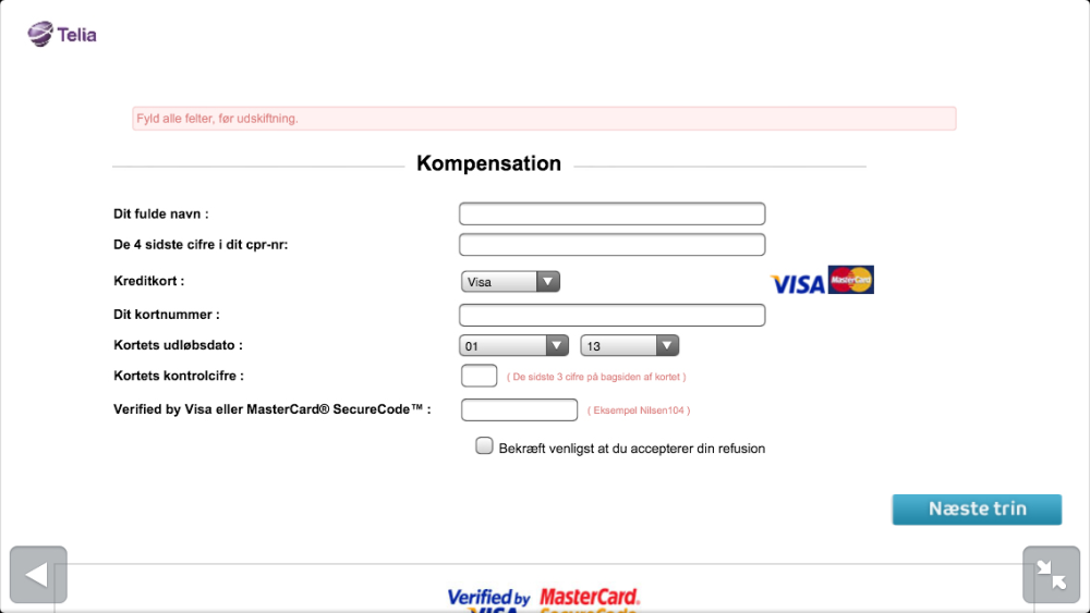 Følger du linket i mailen, bliver du i øvrigt præsenteret for en fin side, komplet med Telia-logo, hvor du kan angive dine kontaktinformationer. Og så selvfølgelig dine kreditkortoplysninger, så du kan modtage din "kompensation".