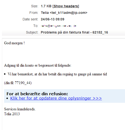 Men det nye er nu, at det er teleselskabet Telia, som svindlerne i deres ubehjælpsomme mail udgiver sig for at arbejde for.