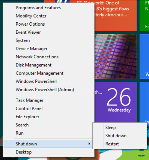 En af de ting, der har bragt sindene i kog i forbindelse med Windows 8, er den manglende Start-knap. Den er nu tilbage, dog ikke med helt de samme funktioner som i Windows 7. Klikker du med højre tast på musen, kan du imidlertid stadig lukke eller genstarte maskinen, som du kender det fra de gode gamle dage.