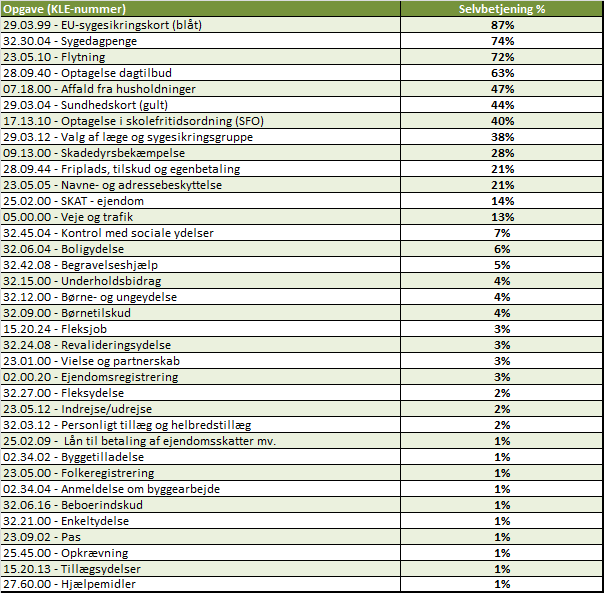 I nedenstående tabel kan du se øjebliksbilledet for, hvordan udbredelsen af de forskellige selvbetjeningsområder i Danmark fordeler sig.