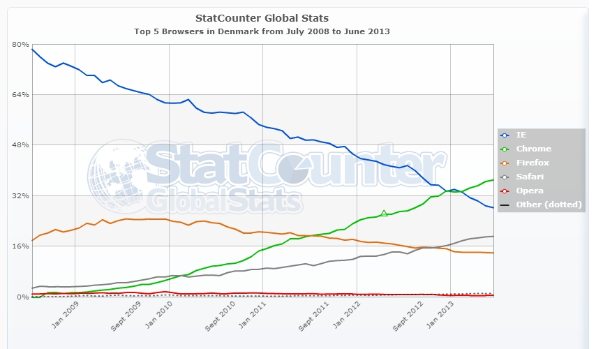 Ovenstående graf fra StatCounter viser den danske browserudvikling i de seneste fem år (klik for større billede):