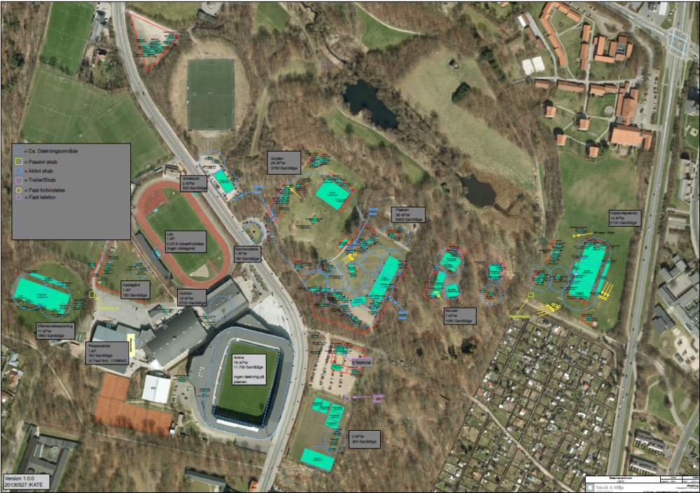 "220 accespoints, cirka 42 kilometer kabler, fem midlertidige master og to Cisco WLC 8510 controlere, der kunne skalleres til 64.000 klienter og 6.000 accesspoints."