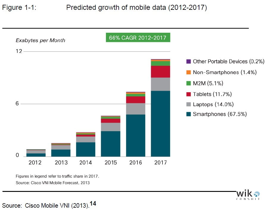 Det er der i høj grad brug for, da man ifølge EU-rapporten venter, at efterspørgslen på internetdata på mobile enheder vil stige med 66 procent om året fra 2012 til 2017.