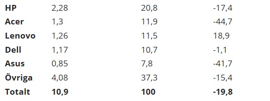 Værst ramt er Acer, der med et samlet salg på blot 1,3 millioner pc'er i alle de vest-europæiske lande er gået hele 44,7 procent tilbage.
