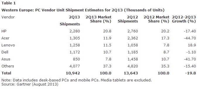 Her ses det, at pc-leverandørernes forsendelser til Vesteuropa var næsten 20 procent mindre i andet kvartal i år i forhold til samme kvartal sidste år.